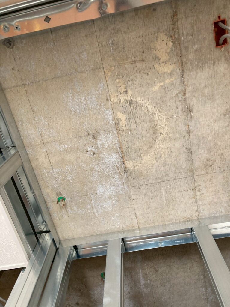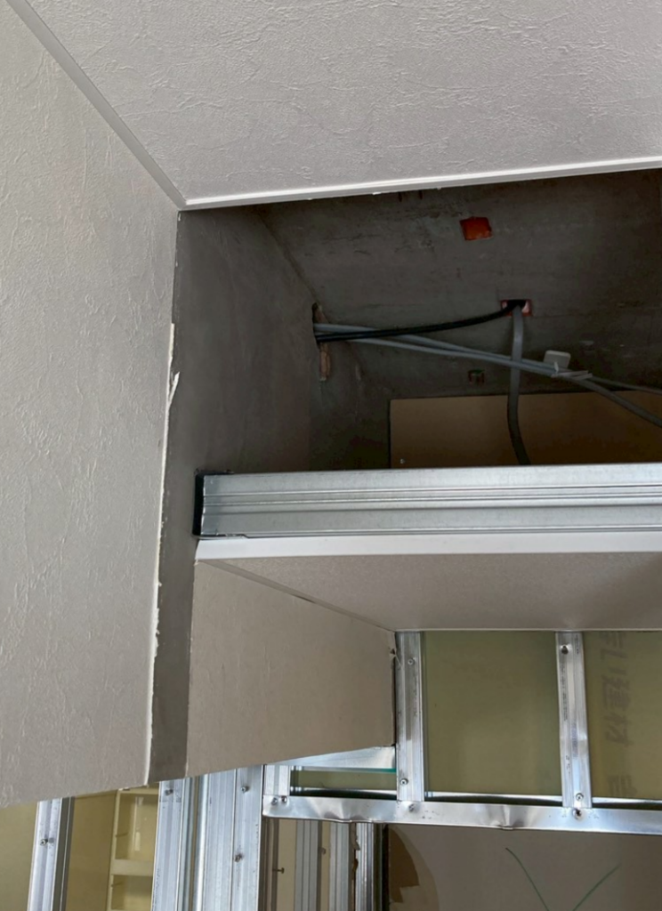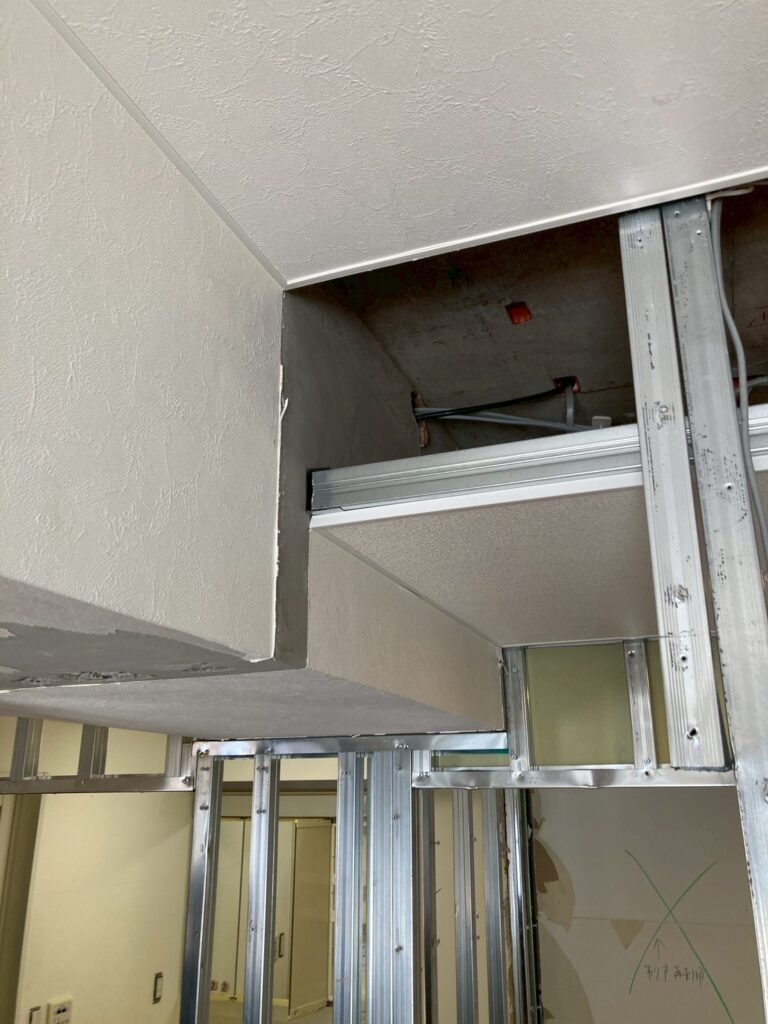 今回のマンションは、天井と床がコンクリートでできている構造です。その間に「軽天(けいてん)」と呼ばれる軽量の下地材を使って、間仕切り壁や天井をつくっていきます。