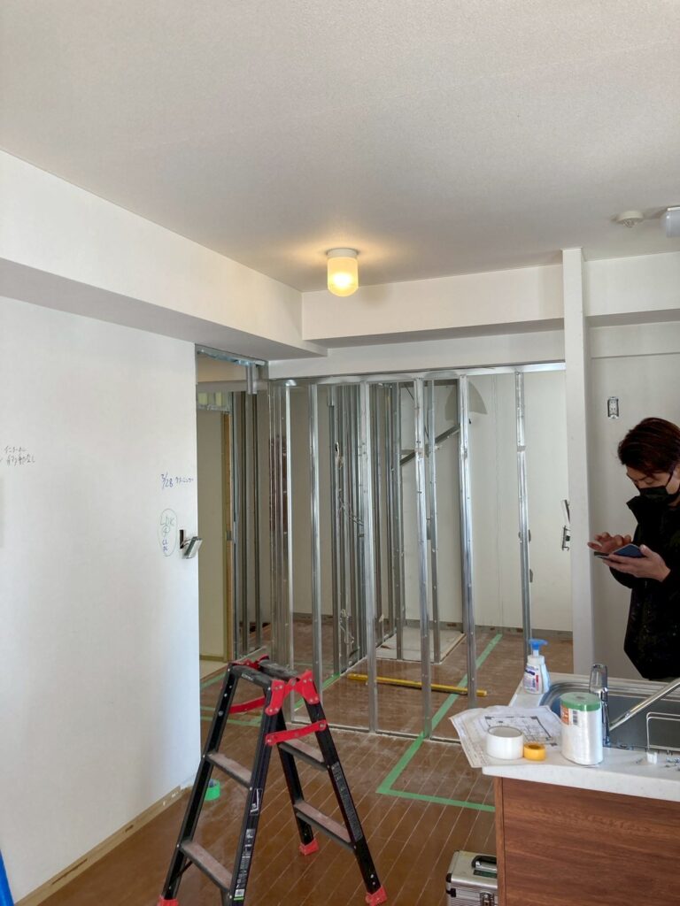 写真にもある通り、コの字型の下地材を床に固定し、そこから天井へと位置を移動。また「スタッド材」と呼ばれる軽量鉄骨の縦下地材(間柱)を立てていきます。そうして格子状の骨組みができあがり、その上に石膏ボードを張ることで壁が完成です。