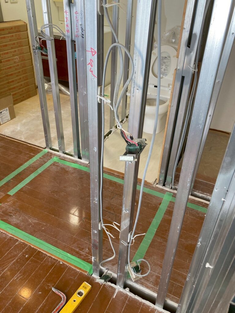 壁の中には配線も通ります。ねずみ色のケーブルは、スイッチから照明器具へと電気を送る「Fケーブル」と呼ばれるもの。今回の間取り変更に伴い、この配線も移設が必要になります。