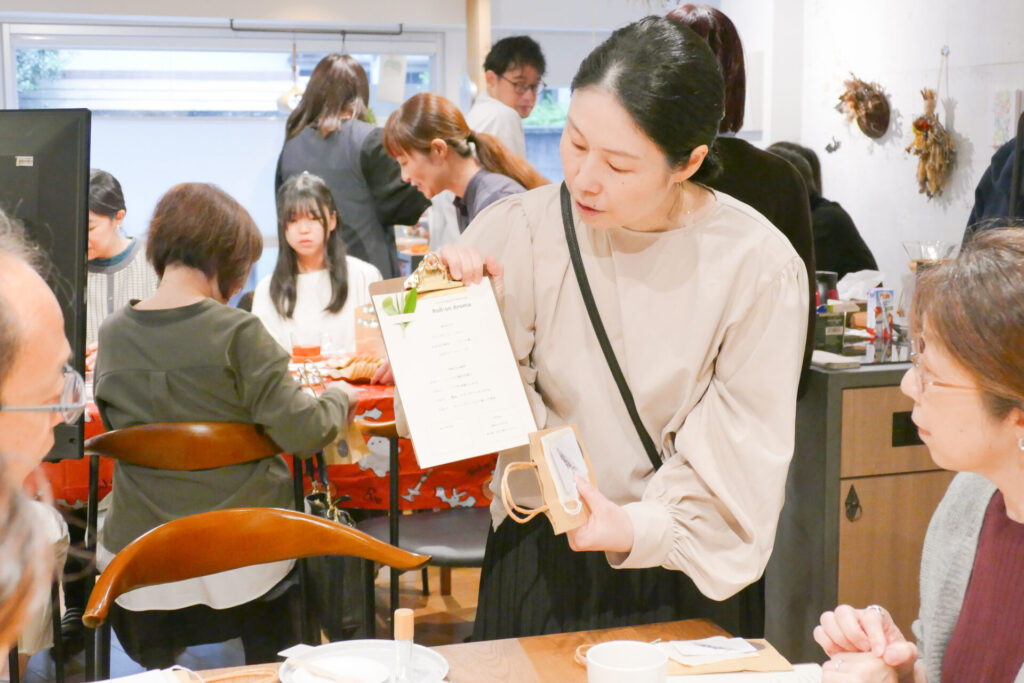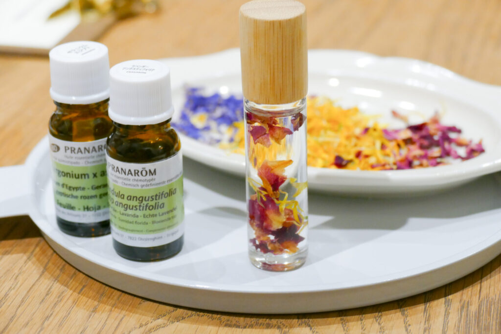 今回のハイライトのひとつが、erbさんによるアロマロールオンづくりのワークショップ。彩り豊かなドライフラワー、精油の香りで五感が自然と開いていくような、穏やかな時間が流れました。