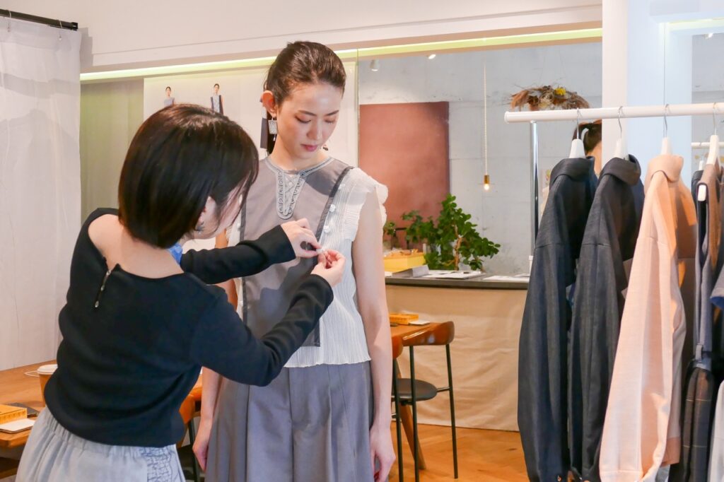 「この服は一着で本当にいろんなバリエーションができるようになっているので、いろんなお客さまのいろんな生活のシーンにちょっと寄り添えるお洋服作りをしています。ちょっとあったら心強い一着として、お迎えいただけたら嬉しいです」(Kana Kawasaki)