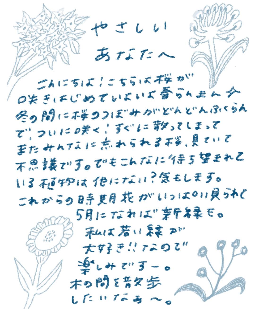 お元気ですか? 週に一度、あなた宛にお手紙を書きます。まだ薄暗い冬の朝、早春の木々の蕾の膨らみ、真夏に背を伸ばす草たち、秋の落ち葉を踏みしめる音。そっとお手紙を開くと季節ごとの移ろいを感じられます。日々の小さな出来事を通して、笑ったり、泣いたり、心が揺らいだり。どんな時もあなたの心にそっと寄り添ってくれる、そんなお手紙です。