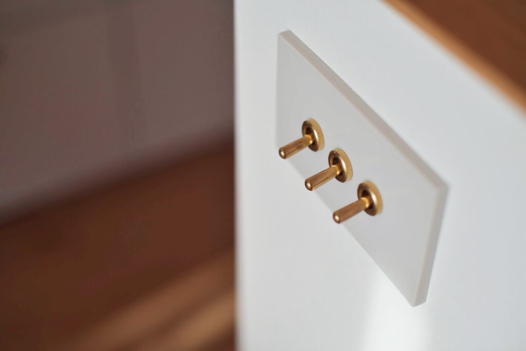 ふたつめは、金属のプレートに小さな突起がついた、レトロなスイッチ。【Panasonicクラシックシリーズ】や【toolboxトグルスイッチ】は メカニカルでどこか懐かしい佇まいです。このスイッチの魅力は、オン・オフするときの「パチン、パチン」という操作感。 インダストリアルな空間やヴィンテージ家具との相性は抜群でオススメです。 電気をつけるという日常の動作が、ちょっと楽しくなるようなアイテムです。