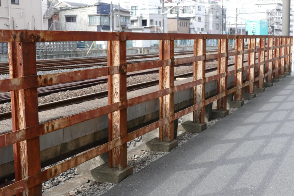 オビキ:線路脇の柵のサビも、ローカルですね。