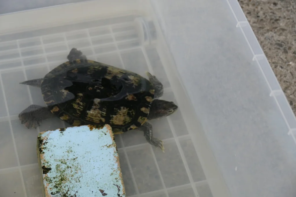 ふと視線を落とすと、プラスチックの衣装ケースにカメが一匹泳いでいました。