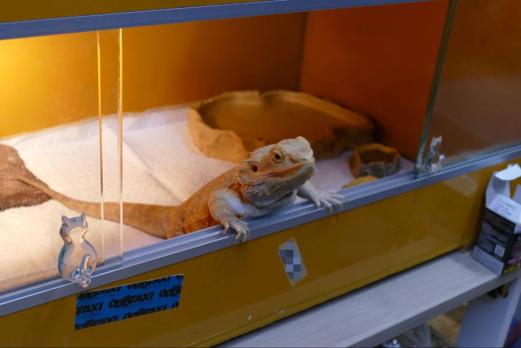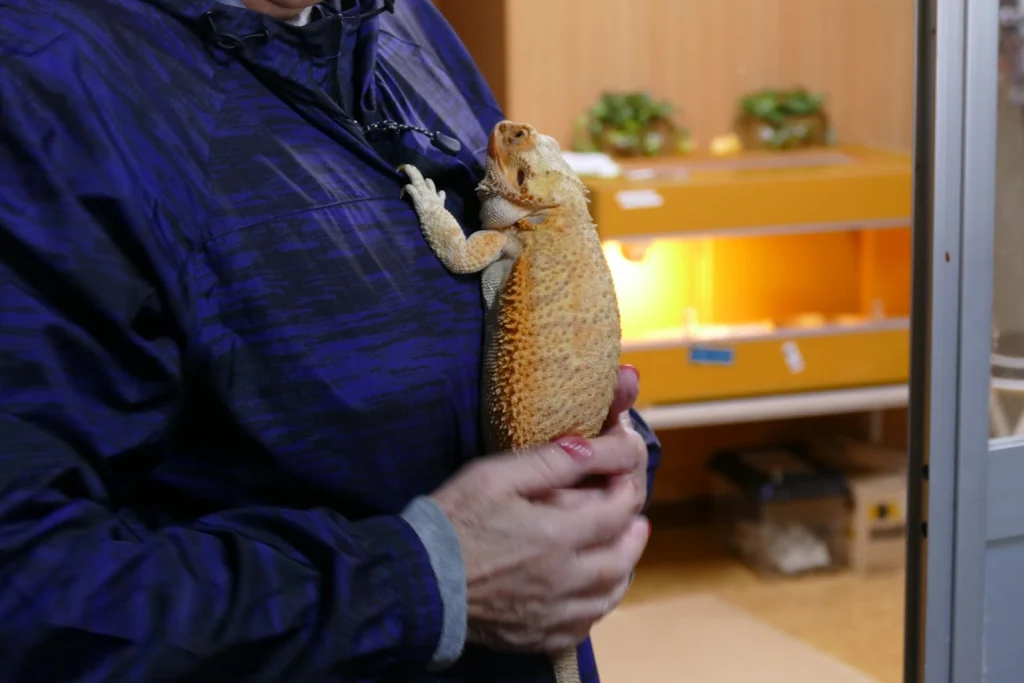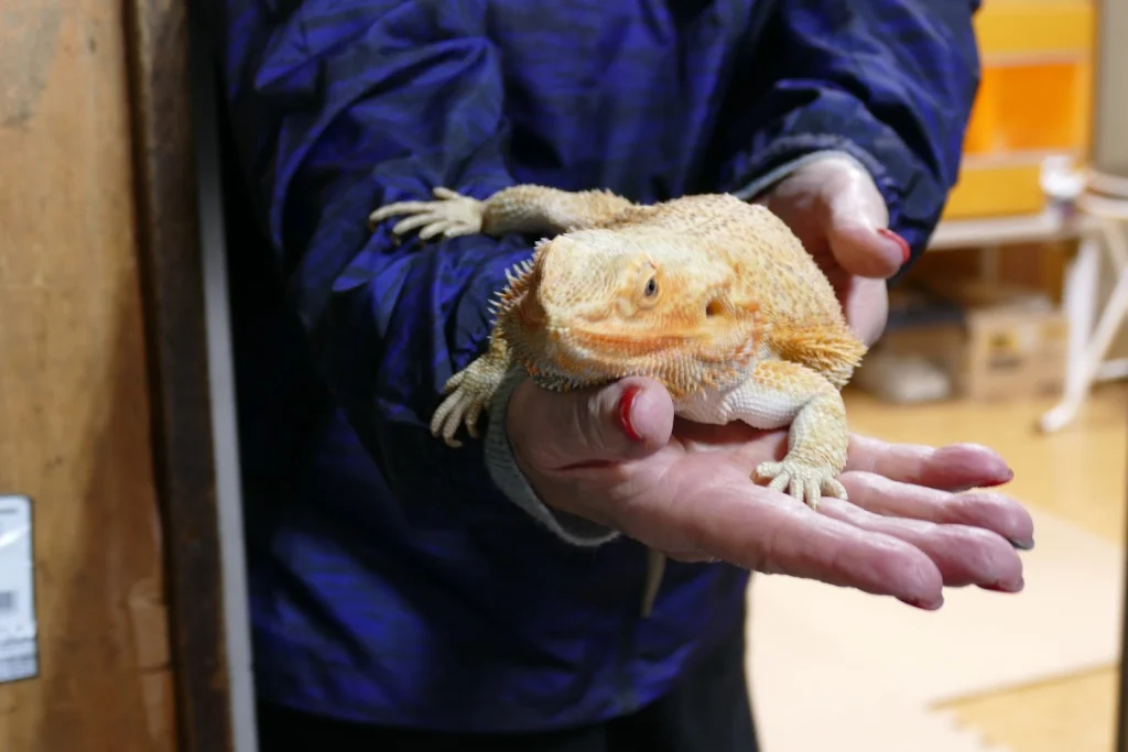家主さん:この子はね、フトアゴヒゲトカゲっていうの。「いい子、いい子」ってなでると、目をつぶるの。にこちゃんっていいます。
