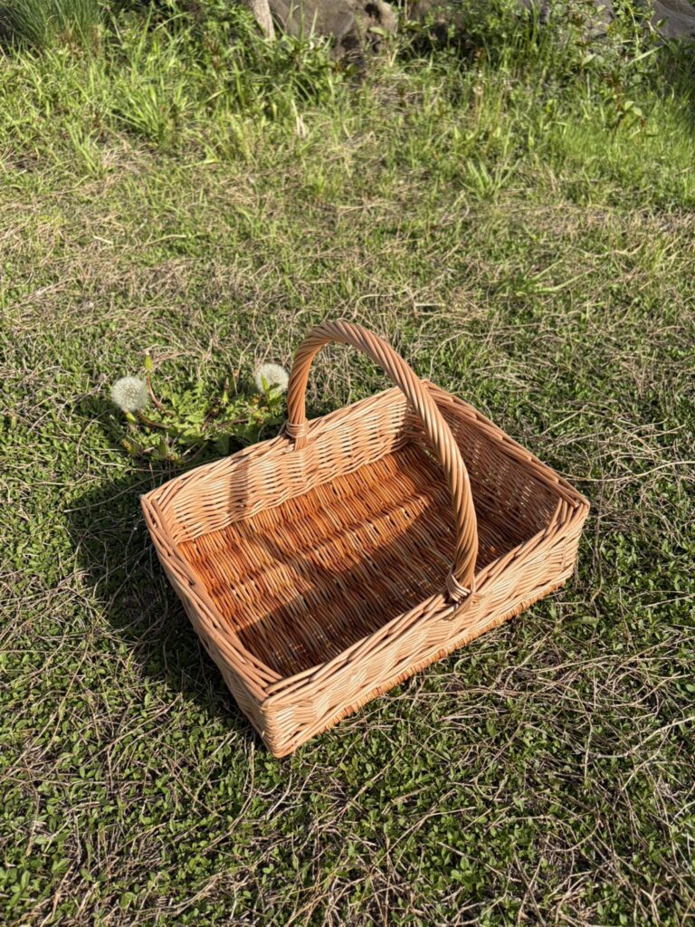 今回つくったのは、この夏に向けた収穫用のかご。取っ手付き・浅めの四角かごで、野菜やお花をそのまま持ち運べるように製作しました。使い勝手よく、でも手のぬくもりが感じられる道具として、毎日の暮らしに加わります。